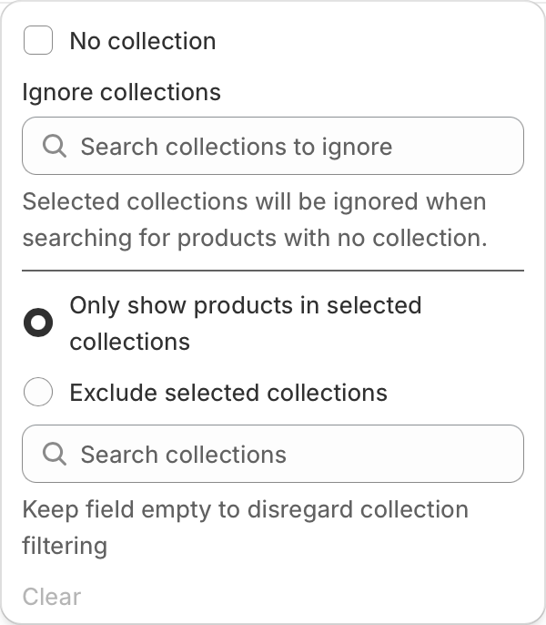 This filter’s point is to ensure products are assigned a meaningful collection, instead of the usual All products, Best selling, and New products collections. This could be achieved using both the No collection & Ignore collections filters.